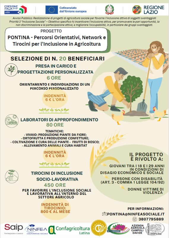 C’è anche Fondi tra le città che hanno aderito a “Pontina – percorsi orientativi, network e tirocini per l’inclusione in agricoltura”, un progetto promosso dalla Ninfea Cooperativa Sociale mediante la partecipazione ad un avviso pubblico regionale. Scopo del percorso quello di favorire il coinvolgimento attivo di soggetti svantaggiati e promuovere le pari opportunità.