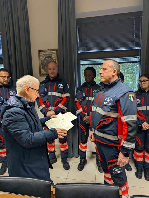Riconoscimento simbolico per l’Associazione di Falchi di Pronto Intervento coordinata dal presidente Mario Marino che, la notte tra il 31 dicembre 2025 e il 1° gennaio 2026, non solo ha presidiato le numerose manifestazioni in corso tra le quali il Capodanno in Piazza ma ha anche salvato due persone, un ragazzo che minacciava il gesto estremo in Piazza De Gasperi, e una donna di 93 anni, sola nella sua casa di via dei Colonna, dove era divampato un incendio partito da una vettura in sosta. All’arrivo dei Falchi le Fiamme avevano già raggiunto la tapparella e pochi minuti di ritardo sarebbero potuti risultare fatali.