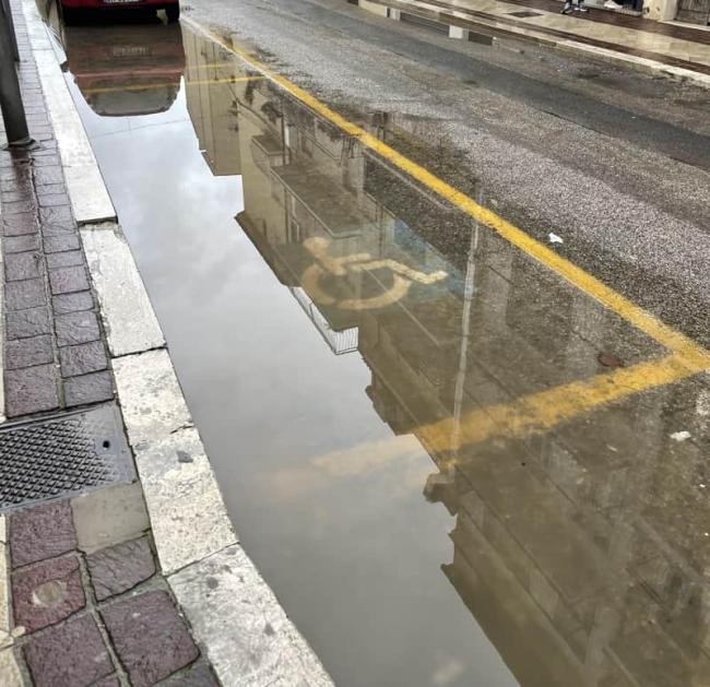Allego una foto emblematica: un parcheggio per disabili completamente allagato, a causa di un tombino che presenta problemi da anni. In queste condizioni, come può una persona con disabilità scendere dall’auto? E una volta scesa, dove dovrebbe andare?
