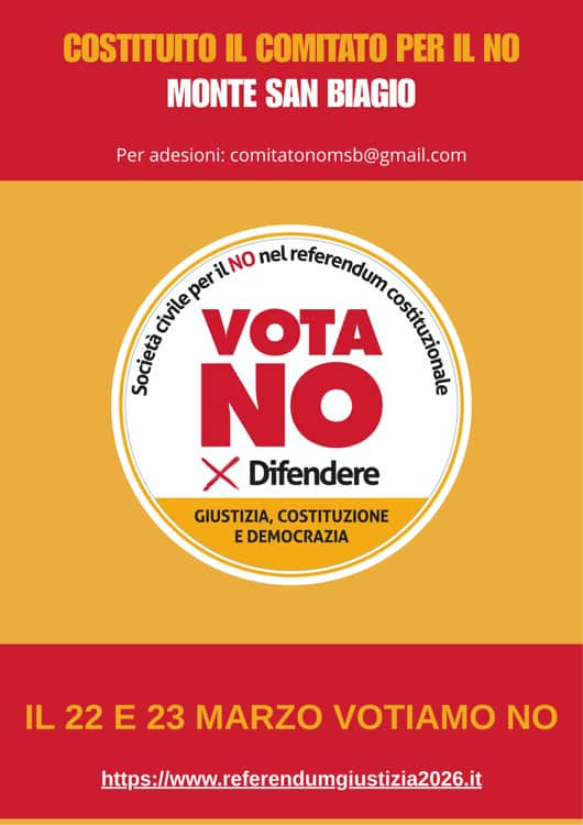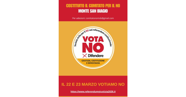 Si è costituito ufficialmente anche a Monte San Biagio il Comitato per il NO al Referendum Costituzionale sulla riforma della Giustizia. Hanno aderito realtà associative, sindacali e politiche del territorio, insieme a singoli cittadini che hanno scelto di impegnarsi attivamente nel dibattito pubblico e nella difesa dei principi costituzionali.