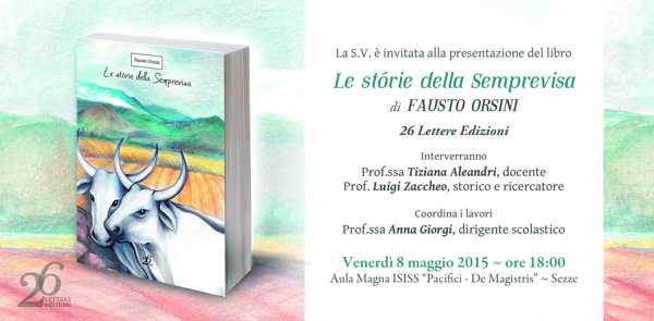 Presentazione ufficiale per Le stòrie della Semprevisa, l’ultimo libro di Fausto Orsini (26 Lettere Edizioni). L’appuntamento è per venerdì 8 maggio alle ore 18 nell’aula magna dell’ISISS “Pacifici-De Magistris” di Sezze. Oltre all’autore, interverrà la professoressa Tiziana Aleandri e il professor Luigi Zaccheo, storico e ricercatore. Coordinerà i lavori il dirigente scolastico, Anna Giorgi.