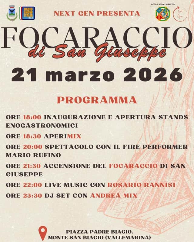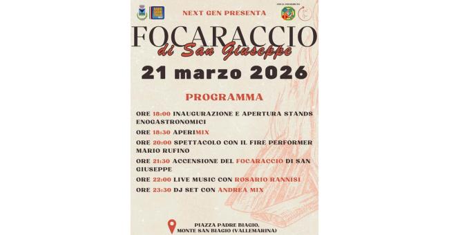 Monte San Biagio si prepara a vivere uno degli appuntamenti più sentiti della tradizione locale: il Focaraccio di San Giuseppe, in programma sabato 21 marzo 2026 in Piazza Padre Biagio (Vallemarina).