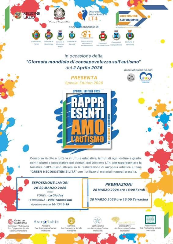 L’ATS “Costruire Autonomie” —: rete, integrazione e inclusione per l’Autismo, che vede la sinergia tra Centro per l’Autonomia s.c.s, Astrolabio s.c.s, Demetra a.p.s, LatinAutismo a.p.s, LiberaMente a.p.s e Rete Solidale a.p.s — in collaborazione con il Distretto Socio-Sanitario LT4, ha il piacere quest’anno di essere organizzatore di questa speciale iniziativa che prenderà il nome di “Special Edition 2026 RappresentiAMO l’Autismo by Costruire Autonomie”.