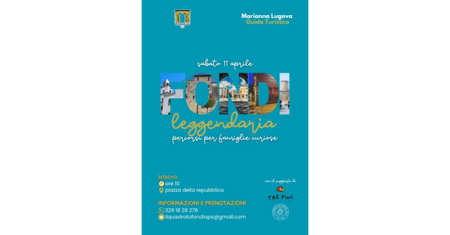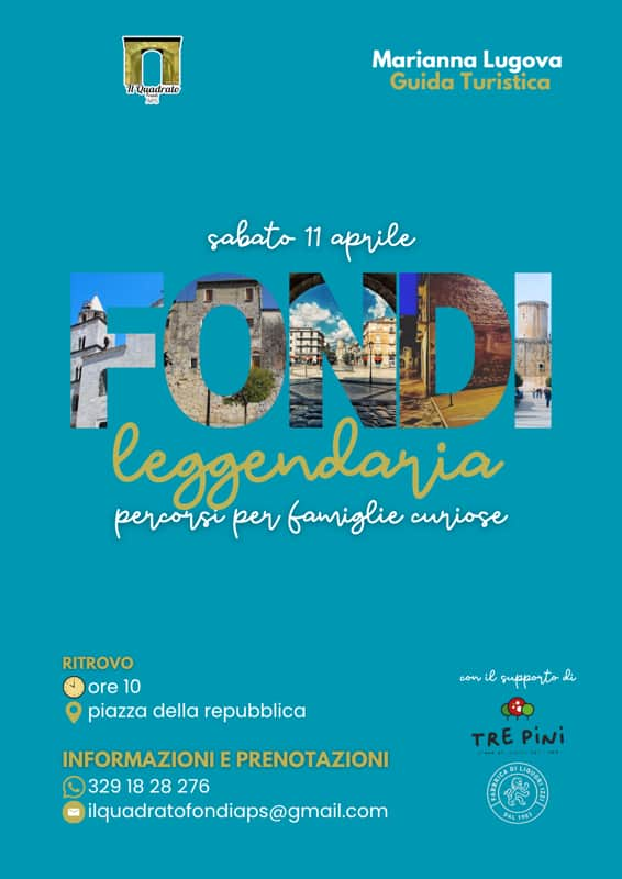 "Un viaggio tra storia, mistero e racconti antichi". Dopo il successo della prima tappa, l'Associazione Il Quadrato Fondi - APS presenta una nuova iniziativa in programma Sabato 11 Aprile. "Scopri Fondi come non l’hai mai vista" recita l'invito a partecipare ad un’escursione che si preannuncia affascinante, tra le vie ed i luoghi simbolo della Città, alla scoperta delle sue leggende più suggestive. Un’occasione speciale per condividere emozioni, imparare divertendosi e riscoprire insieme la bellezza del nostro territorio. Insieme alla Guida Turistica Marianna Lugova, con il supporto di Pizzeria Tre Pini e Izzi Liquori, storiche realtà della nostra Fondi.