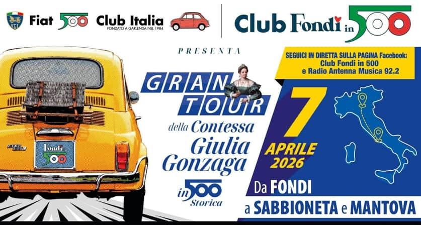 Il Club “Fondi in 500” quest’anno ha organizzato, con il patrocinio del Comune di Fondi, il “Gran Tour della Contessa”. Il gruppo di utilitarie storiche partirà il 7 aprile per raggiungere Sabbioneta e Mantova. Dopo le passate esperienze (Dachau 2023, Tour della Sicilia 2024 e il Tour da Fondi al Mare del nord 2025) in occasione dei 500 anni del matrimonio (1526 – 2026) tra la bellissima Giulia Gonzaga, figlia di Ludovico Gonzaga signore di Gazzuolo, Sabbioneta e Viadana, e Vespasiano Colonna, Conte di Fondi e Duca di Traetto, l’organizzazione ha optato per un tour storico alla riscoperta delle radici della contessa.
