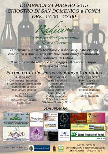 Domenica 24 Maggio p.v., dalle ore 17.00 alle 23.00, il chiostro di San Domenico di Fondi ospiterà l’evento “Radici. La Nostra EnoGastronomia, il Nostro Territorio”. L’iniziativa – promossa dall’Azienda Agricola Dream e patrocinata da Comune di Fondi, Parco Naturale Regionale Monti Ausoni e Lago di Fondi e Coldiretti – si prefigge di dare lustro alla tradizione enogastronomica della nostra provincia promuovendone e valorizzandone i prodotti.