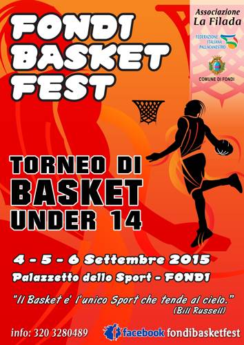 Da Venerdì 4 a Domenica 6 Settembre prossimi presso il Palazzetto dello Sport di via Mola di Santa Maria si svolgerà l’evento sportivo “Fondi Basket Fest”, Torneo di Basket giovanile riservato alla categoria Under 14 (2002 - 2003). L’iniziativa – patrocinata dal Comune di Fondi e dalla Federazione Italiana Pallacanestro – è promossa dall’Associazione di promozione sportiva e sociale La Filada, già organizzatrice del Palio di Fondi.