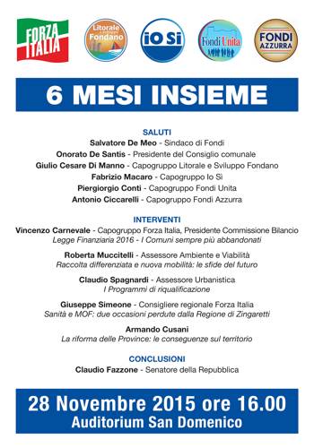 A sei mesi dall’insediamento della seconda Amministrazione a guida del Sindaco Salvatore De Meo raccontiamo le tante cose fatte, le tante cose da fare e le tante difficoltà da superare insieme. E’ questo lo spirito che ha animato i gruppi consiliari di Forza Italia, Litorale e Sviluppo Fondano, Io Si, Fondi Unita e Fondi Azzurra nell’organizzare l’incontro pubblico previsto per Sabato 28 Novembre alle ore 16.00 presso l’Auditorium San Domenico. Questo appuntamento rappresenta il primo di una serie di incontri che semestralmente si terranno per illustrare l’operato amministrativo e renderne partecipi i cittadini.