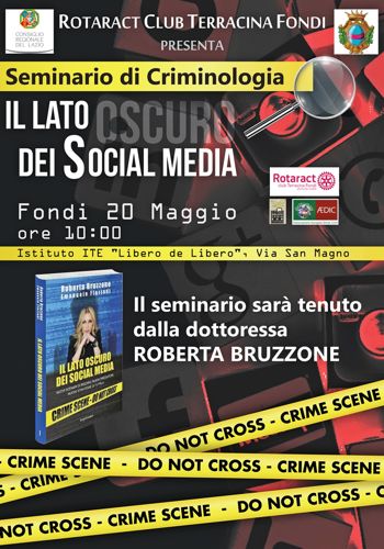 Venerdì 20 Maggio p.v., dalle ore 10.00 alle 13.00, presso la palestra dell’ITE “Libero de Libero” di Fondi si svolgerà un Seminario di Criminologia organizzato dal Rotaract Club Terracina Fondi del Distretto Rotaract 2080. L’iniziativa si avvale del patrocinio del Consiglio Regionale del Lazio, del Comune di Fondi e del Sistema Bibliotecario del Sud Pontino. Il seminario sarà tenuto dalla criminologa e psicologa forense Roberta Bruzzone, che presenterà il suo ultimo libro “Il lato oscuro dei social media. Nuovi rischi, nuovi predatori, nuove strategie di protezione”. L’autrice è stata consulente nei più famosi processi penali degli ultimi anni ed è molto nota al pubblico televisivo.