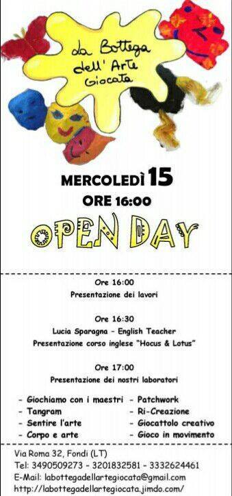 Il prossimo mercoledì 15 giugno, dalle 16 in poi, la “Bottega dell’arte giocata” a Fondi, dal progetto di Alessandra Forcina, Carlo Zarone e Maria Ilaria D’Andrea, terrà un open-day per presentare le attività laboratoriali che nascono dall’accostamento dell’arte ai bambini. “Giochiamo con i maestri”, “Tangram”, “Sentire l’arte”, “Corpo e arte”, “Patchwork”, “Ri-creazione”, “Giocattolo creativo” e “Gioco in movimento” sono i nomi delle varie attività a cui i bimbi potranno avvicinarsi. “Presentiamo i nostri laboratori e faremo delle dimostrazioni pratiche con i bimbi – anticipano i promotori dell’inziativa, nonchè responsabili del progetto – quindi faranno in piccolo ciò che facciamo poi nei laboratori e in più presenteremo Lucia Sparagna che è un’insegnante di inglese che farà questo corso di inglese “Hocus & Lotus”. È un corso particolare, ricercato e di eccellenza in cui è fondamentale l’interazione del genitore a casa perciò sarà indispensabile la presenza dello stesso il giorno della presentazione. Chi vuole iscrivere il proprio figlio al corso di inglese deve partecipare alla presentazione! Perché è particolare! Si consigliano magliette atte al lavoro con i colori!”.