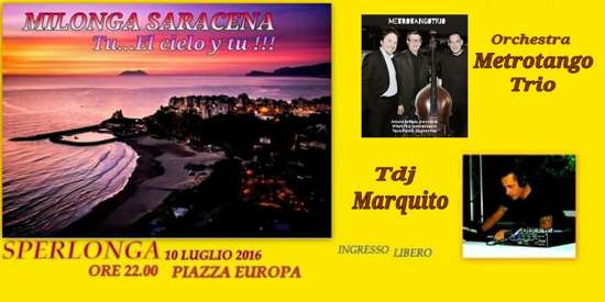 Per l’occasione di una serata, piazza Europa con la sua bellissima vista sul mare di levante, farà da cornice scenografica ad una vera e propria “milonga”, luogo deputato al ballo del tango. La serata, “Milonga Saracena”, che rientra nella kermesse di manifestazioni dell’Amministrazione comunale “D’Estate Sperlonga”, prenderà il via alle 22,00 di domenica 10 luglio in piazza Europa con la musica dal vivo dell'orchestra “MetroTangoTrio”. Formata da 3 elementi (Antonello Maio al pianoforte, Willem Peci al contrabbasso e Paolo Petrilli alla fisarmonica/Bandoneon), il gruppo propone una selezione di brani che spaziano dai tanghi più antichi come "La Cumparsita" fino alla modernizzazione di Astor Piazzolla, passando per la così detta epoca gloriosa, quella del 40'.