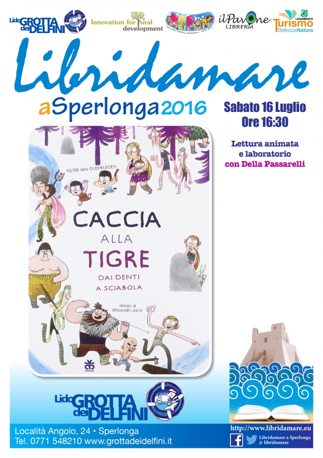 Sabato 16 luglio 2016 torna Libridamare a Sperlonga, rassegna di letteratura per ragazzi, con il secondo appuntamento, come sempre nella bella cornice del lido Grotta dei Delfini di Sperlonga, con ingresso gratuito. Alle ore 16:30, Della Passarelli, direttrice editoriale di Sinnos, presenterà il libro “Caccia alla tigre dai denti a sciabola” attraverso una coinvolgente lettura animata dedicata ai bambini, in collaborazione con gli animatori di PidiPupi.
