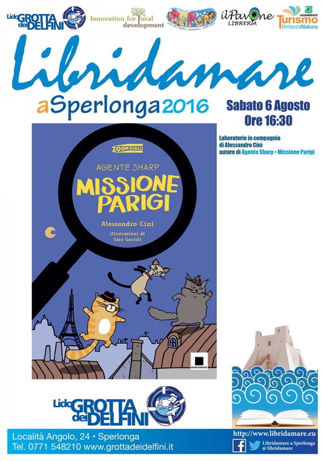 Anche questa volta sarà un appuntamento speciale, un laboratorio creativo tutto dedicato ai bambini. A presentare il libro illustrato “Agente Sharp – Missione Parigi” sarà l'autore Alessandro Cini, che coinvolgerà i piccoli in una entusiasmante avventura interattiva in compagnia del gatto Sharp, un furbissimo agente segreto sotto mentite spoglie. Libridamare a Sperlonga 2016 è organizzata dall’associazione IfoRD, dalla libreria Il Pavone di Fondi e dal centro educativo polivalente PidiPupi di Fondi, in collaborazione con il Lido Grotta dei Delfini di Sperlonga che ospita l’evento.