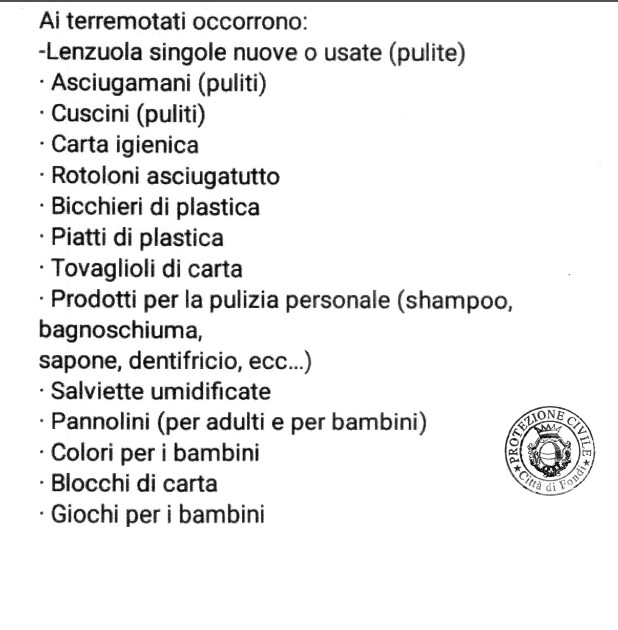 La Protezione Civile “ CITTA’ DI FONDI ” ha attivato in città un punto di raccolta per i beni di prima necessità per i terremotati della provincia di Rieti di nei Comuni di Amatrice, Accumuli, e Arquata del Tronto Provincia di Ascoli Piceno, dedicato in particolar modo ai bambini e alle mamme. Presso la propria sede sita in Via Acquachiara al nr° 51 (Ex Mattatoio Comunale). Tutti i beni saranno consegnati direttamente dai nostri Volontari. Chi vuole si può rendere utile anche come Volontario ad aiutarci per impacchettare con noi i beni che proverranno dalla raccolta. Per ulteriori informazioni potete contattarci ai seguenti numeri telefonici: - 340/2818100 – 333/8146766 e-mail: protezionecivilefnd@libero.it Aiutateci ad Aiutare. In sovraimpressione la lista dei beni necessari con il timbro della protezione civile.