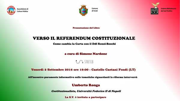 Venerdì 2 Settembre p.v. alle ore 19.00 presso la Sala convegni del Castello Caetani di Fondi avrà luogo la presentazione del libro di Simone Nardone “Verso il Referendum Costituzionale” (StreetLib, 2016). L’iniziativa, cui prenderà parte il costituzionalista Umberto Ronga, è promossa dall’Associazione di Cultura Politica Obiettivo Comune ed è patrocinata dal Comune di Fondi e dal Sistema Bibliotecario del Sud Pontino.