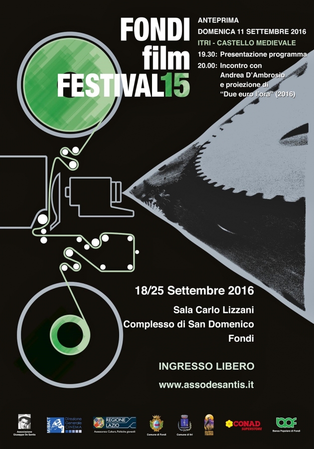 La novità di quest’anno è rappresentata dalla sinergia con un Comune limitrofo a Fondi, al fine di ampliare l’area territoriale della proposta culturale. La XV edizione si aprirà pertanto con un’anteprima, che avrà luogo Domenica 11 Settembre con inizio alle ore 19.30 presso il Castello Medievale di Itri. A fare gli onori di casa saranno il Sindaco Antonio Fargiorgio e l’Assessore alla Cultura Paola Soscia, che hanno accolto con entusiasmo la proposta dell’Associazione Giuseppe De Santis. A seguire il direttore artistico del FFF Marco Grossi e l’organizzatore generale Virginio Palazzo presenteranno il programma completo della rassegna, che sarà distribuito al pubblico. Alle ore 20.00 è previsto l’incontro con il regista Andrea D’Ambrosio e la presentazione e proiezione del suo film d’esordio “Due euro l’ora” (2016), vincitore di numerosi premi, tra cui al “Bari Film Festival” quello per la miglior regia e per la migliore attrice protagonista Chiara Baffi, al “Festival Molise Cinema” del premio del pubblico e, proprio pochi giorni fa, al “Montreal Film Festival” del Bronze Zenith for the First Fiction Feature Film.