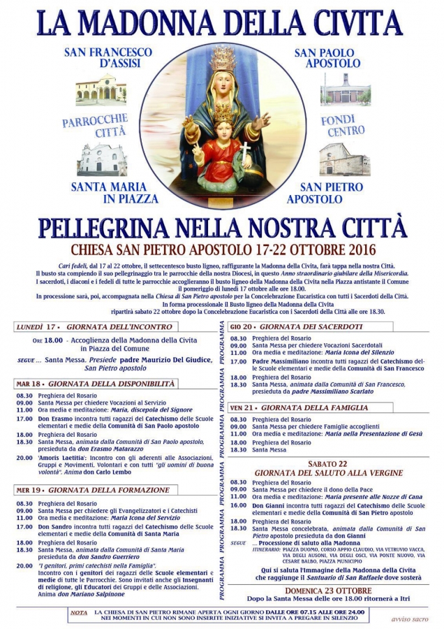 Lunedì 17 Ottobre inizierà nella Città di Fondi la Peregrinatio giubilare del busto ligneo della Madonna della Civita: l’effige della Vergine Maria sosterà presso la chiesa di San Pietro Apostolo in Fondi fino a sabato 22 ottobre.