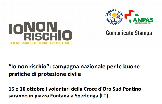 Per il sesto anno consecutivo il volontariato di Protezione Civile, le istituzioni e il mondo della ricerca scientifica si impegnano insieme campagna di comunicazione nazionale sui rischi naturali che interessano il nostro Paese. Il weekend del 15 e 16 ottobre 7.000 volontari e volontarie di protezione civile allestiranno punti informativi “Io non rischio” in circa 700 piazze distribuite su tutto il territorio nazionale per diffondere la cultura della prevenzione e sensibilizzare i propri concittadini sul rischio sismico, sul rischio alluvione e sul maremoto. A poco meno di due mesi dal sisma che ha colpito il centro Italia il mondo del volontariato, che insieme al Servizio Nazionale della Protezione Civile è in prima linea nella gestione dell’emergenza, si farà portavoce delle buone pratiche di prevenzione dei rischi. Sabato 15 e domenica 16 ottobre, in contemporanea con altre piazze in tutta Italia, i volontari dell’associazione Croce d'Oro Sud Pontino partecipano alla campagna con un punto informativo “Io non rischio” allestito a Sperlonga in piazza Fontana per incontrare la cittadinanza, consegnare materiale informativo e rispondere alle domande su cosa ciascuno di noi può fare per ridurre il rischio terremoto e maremoto.