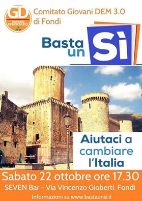 «Aiutaci a cambiare l’Italia». È l’appello del Comitato Giovani Dem 3.0 che si sta battendo per sensibilizzare la cittadinanza affinché al prossimo referendum costituzionale voti Sì. Per parlare di cosa cambierà nel dettaglio e per spiegare diversi aspetti della riforma, il comitato invita la cittadinanza ad un incontro pubblico che si terrà sabato 22 ottobre alle 17:30 al Seven Bar di via Gioberti a Fondi. Ulteriori informazioni sul sito, www.bastaunsi.it