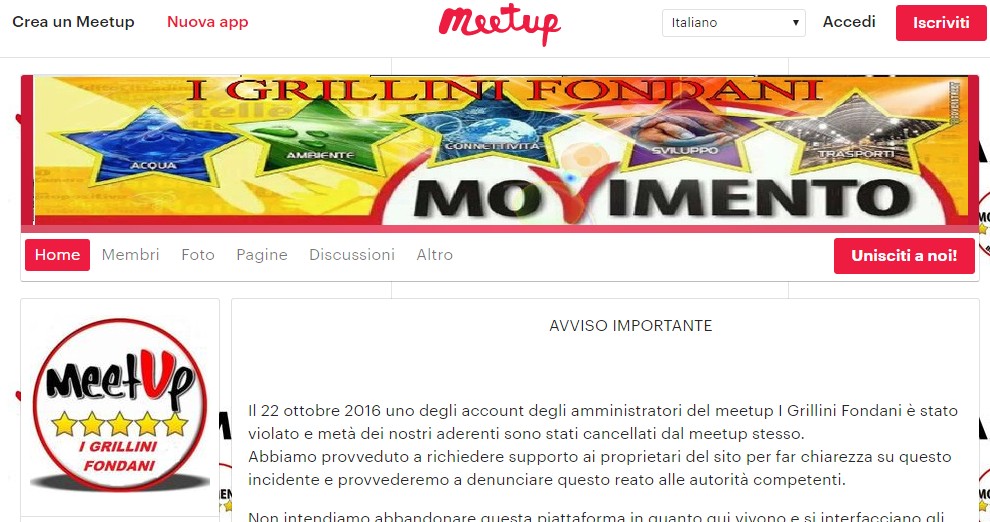 La settimana scorsa uno degli account degli amministratori del meetup I Grillini Fondani è stato violato e metà dei nostri aderenti sono stati cancellati dal meetup stesso. Abbiamo provveduto a richiedere supporto ai proprietari del sito per far chiarezza su questo incidente e provvederemo a denunciare questo reato alle autorità competenti.