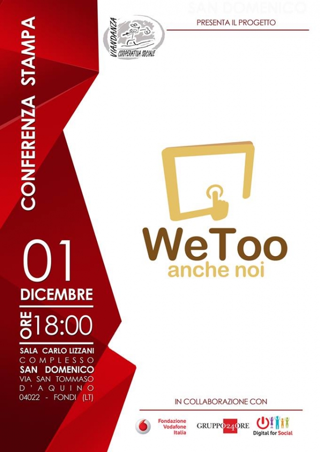Al termine della fase di progettazione la Cooperativa Sociale Viandanza, attiva dal 2007 sul territorio di Fondi e della Regione Lazio, presenta “WeToo – anche noi”. Il progetto è realizzato con il contributo della Fondazione Vodafone Italia, nata nel 2002 dalla volontà della nota multinazionale di creare una struttura completamente dedicata ad attività di solidarietà sociale. Con il bando Digital For Social, Vodafone Italia, intende mettere a disposizione fondi per sostenere progetti di innovazione tecnologica pensati per favorire il mondo del sociale.