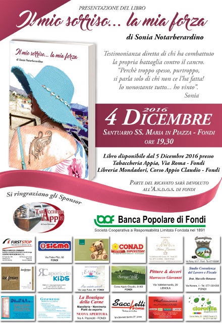 Tutto questo verrà presentato domenica 4 dicembre dalla stessa autrice insieme al parroco del santuario di SS Maria in Piazza. Interverranno, Don Sandro Guerriero, il sindaco di Fondi, Salvatore De Meo, la dott.ssa Elisa Forte, la dott.ssa Claudia Mosillo (reparto Oncologia dell’ospedale Umberto I di Roma), insieme alle autorità locali invitate per l’occasione e ai rappresentanti dell’Andos, a cui andranno i ricavati dalla vendita del libro.