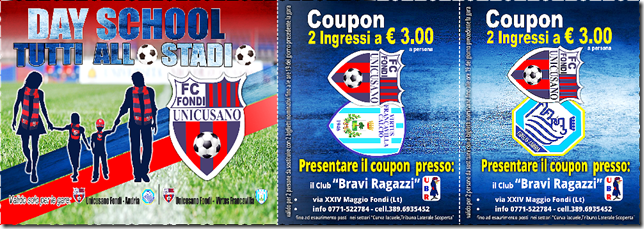 I coupon non sono validi all’ingresso dello stadio ma vanno sostituiti con biglietto nominativo presso il Club UBR “Bravi ragazzi” in via XXIV Maggio a Fondi(Lt) prima della gara.