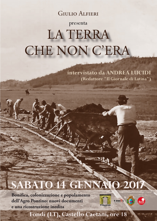 L'Associazione Culturale "Il Quadrato" ha il piacere di invitarvi a partecipare alla Presentazione del Libro "La terra che non c'era" (Editrice Betti, Ottobre 2014) di Giulio Alfieri, in programma Sabato 14 Gennaio 2017 a Fondi (Latina), alle ore 18, presso la Sala al Piano Terra di Castello Caetani, con ingresso da Piazza Matteotti.