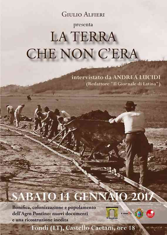 Sabato 14 Gennaio p.v., alle ore 18.00 presso la Sala convegni del Castello Caetani di Fondi, avrà luogo la presentazione del libro “La terra che non c’era” (Editrice Betti, 2014) di Giulio Alfieri. L’iniziativa è organizzata dall’Associazione Culturale “Il Quadrato” in collaborazione con l’Associazione “Omnis” e il patrocinio del Comune di Fondi. L’autore sarà intervistato dal giornalista Andrea Lucidi, redattore de «Il Giornale di Latina», e prenderà parte alla manifestazione il pioniere Fernando Cristini, uno degli ultimi rimasti in vita, per una testimonianza diretta relativa alla bonifica del Salto di Fondi.