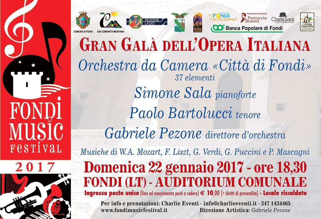 Il concerto di apertura della nuova stagione, dopo l’anteprima di Capodanno, si terrà Domenica 22 Gennaio p.v. alle ore 18.30 a Fondi presso l’Auditorium comunale e vedrà esibirsi l’Orchestra da Camera “Città di Fondi”, il pianista Simone Sala, il tenore Paolo Bartolucci e il direttore d’orchestra Gabriele Pezone, che presenterà i brani eseguiti nel corso della manifestazione. Il programma prevede l’esecuzione di opere di Mozart (​Ouverture da “Le nozze di Figaro”), Liszt (“Concerto per pianoforte ed orchestra n. 1 in Mi bemolle maggiore S 124 - Allegro maestoso, Quasi adagio, Allegretto vivace - Allegro animato, Allegro marziale animato), Verdi (Preludio al I atto de “La Traviata”), Puccini (“E lucevan le stelle”), Mascagni (Intermezzo da “Cavalleria rusticana” e “Mamma, quel vino è generoso”) e nuovamente Verdi (Ouverture da “Nabucco”).