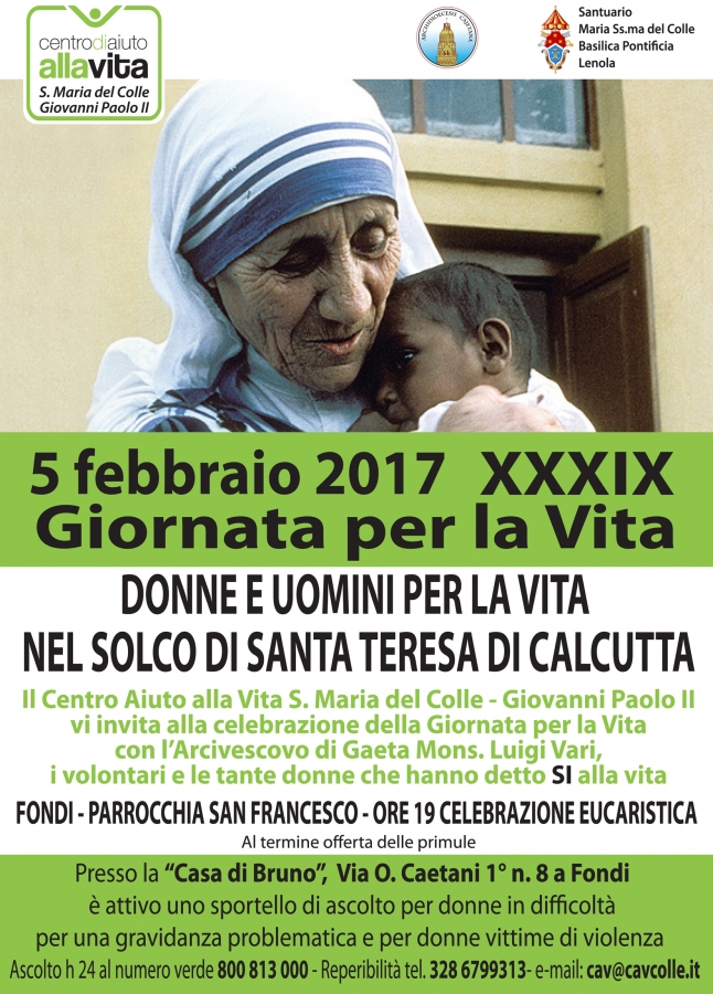 Domenica 5 febbraio alle ore 19:00 presso la chiesa di San Francesco d’Assisi in Fondi, il Centro di Aiuto alla Vita “Santa Maria del Colle - Giovanni Paolo II” invita alla celebrazione eucaristica presieduta dall’arcivescovo di Gaeta Luigi Vari, con i volontari e le tante donne che hanno detto ‘sì’ alla vita.