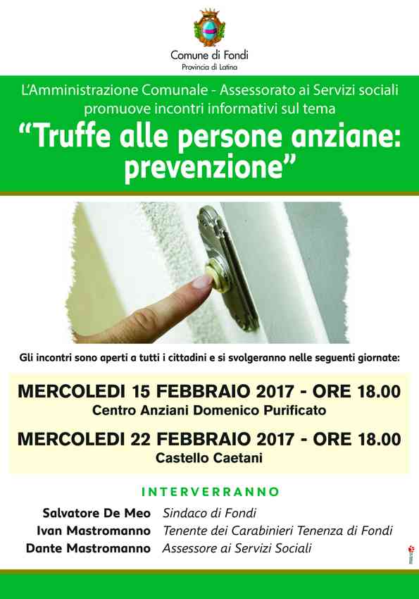 Gli incontri – nel corso dei quali interverranno il Sindaco di Fondi Salvatore De Meo, l’Assessore ai Servizi Sociali Dante Mastromanno e il Tenente dei Carabinieri della Tenenza di Fondi Ivan Mastromanno – sono finalizzati alla prevenzione e al contrasto dei tentativi di truffa, soprattutto ai danni delle persone anziane e sole. Saranno fornite utili informazioni su come comportarsi quando si ricevono telefonate o visite da parte di persone sconosciute e sulle modalità di denuncia delle truffe e dei tentativi di raggiro. Il primo incontro è in programma Mercoledì 15 Febbraio alle ore 18.00 presso il Centro sociale anziani “Domenico Purificato” sito in piazza IV Novembre. L’appuntamento successivo è calendarizzato per Mercoledì 22 Febbraio, sempre alle ore 18.00, presso la Sala convegni del Castello Caetani.