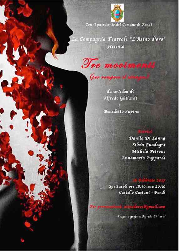La Presidente della Commissione consiliare Pari opportunità Daniela Di Pinto rende noto che Sabato 18 Febbraio p.v. andrà in scena presso il Castello Caetani di Fondi, alle ore 18.30 e in replica alle 20.30, la pièce di teatro-danza “Tre Movimenti. Per rompere il silenzio” scritta da Alfredo Ghilardi, diretta da Benedetto Supino e messa in scena dalla Compagnia teatrale “L’Asino d’oro”. L’iniziativa si avvale del patrocinio del Comune di Fondi. Lo spettacolo – interpretato da Danila Di Lanna, Silvia Guadagni, Michela Petrone, Annamaria Zuppardi – ha debuttato a Formia il 25 e 26 Novembre 2016 in occasione della “Giornata Internazionale contro la violenza sulle donne”, riscuotendo un grande successo di pubblico e di critica, è stato replicato a grande richiesta nella stessa città al Teatro “Remigio Paone” il 5 Gennaio 2017 e a Sperlonga nell’ex chiesa Sanctae Mariae de Sperlonche l’8 Gennaio.