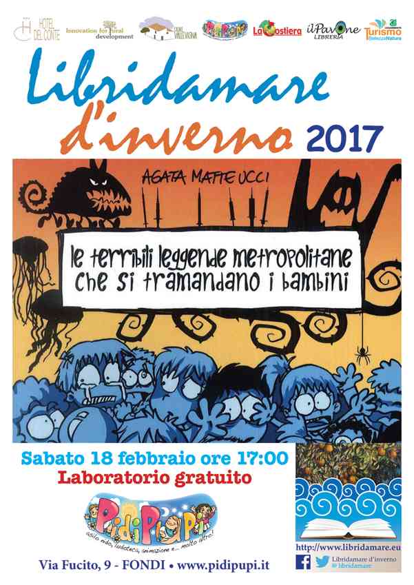 Il prossimo appuntamento è a Fondi, domani, sabato 18 febbraio, alle ore 17.00 presso il centro educativo PidiPupi, in Via Fucito 9. Incontreremo Agata Matteucci, fumettista bolognese, con il suo libro “Le terribili leggende metropolitane che si tramandano ai bambini”, edizioni NPE. Una raccolta di 100 leggende che i bambini si passano tra di loro e che spesso arrivano direttamente dagli adulti: non leccare i francobolli perché potrebbe esserci la droga; se ingoi i semi del cocomero poi ti cresce una pianta nella pancia; le zingare rapiscono i bambini nascondendoli sotto la gonna; le zanzare pungono chi ha il sangue dolce; la febbre ti fa crescere in altezza... Leggende e falsi miti che alimentano immaginari su cui si costruiscono credenze, tabù e divieti, nella fallace convinzione che si impari anche attraverso la paura.