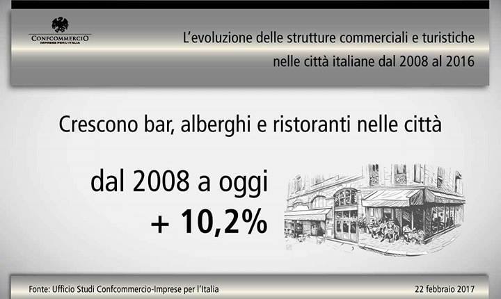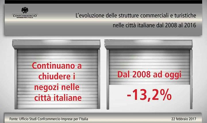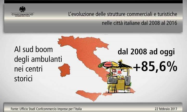 Sono stati esaminati tra l' altro i recenti dati elaborati dall'Ufficio Studi di Confcommercio - Imprese per l'Italia che prendendo spunto dall' esame di 40 comuni italiani di medie dimensioni (escluse le grandi città ), con la distinzione tra Centri Storici e Non Centri Storici, e 13 categorie distributive fanno emergere che le città italiane perdono negozi in sede fissa un po’ più rapidamente rispetto al resto del paese. Che a livello geografico emerge la crescita al Sud delle attività legate al turismo (bar, ristoranti e alberghi) ed una grande crescita del commercio ambulante che dal 2008 ad oggi ha registrato in quest’area un incremento del numero di attività pari all’85,6%.