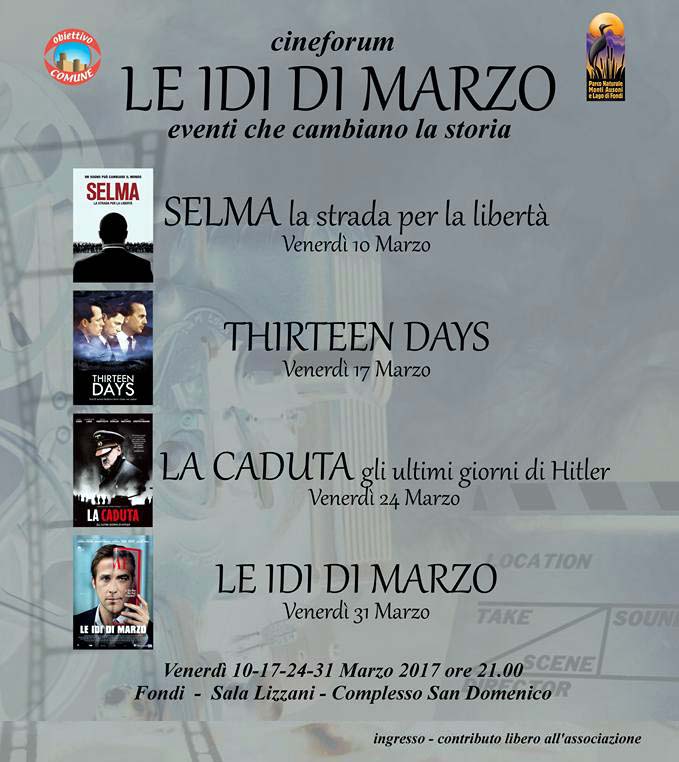 L'iniziativa propone un ciclo di proiezioni su eventi che hanno mutato l'assetto politico internazionale. L'Ingresso è a contributo libero all'associazione. Il primo appuntamento del cineforum è con "Selma", venerdì 10 marzo alle ore 21,00 nella Sala Lizzani all'interno del Complesso di San Domenico di Fondi; “Thirteen days” in proiezione venerdì 17 marzo; “La caduta” – gli ultimi giorni di Hitler per venerdì 24 marzo; “Le Idi di Marzo” a conclusione del cineforum per venerdì 31 marzo sempre alle ore 21,00.