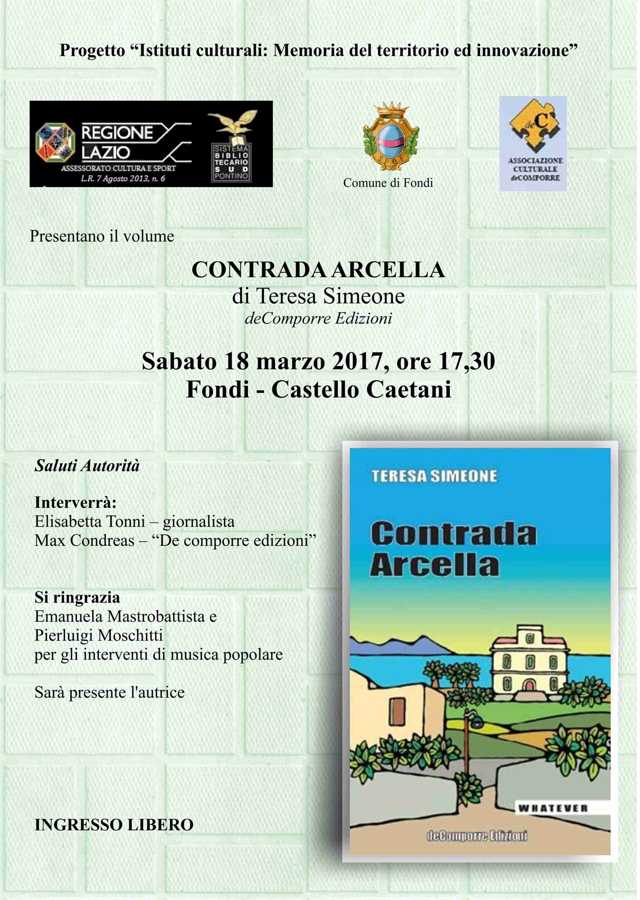 Sabato 18 Marzo p.v. alle ore 17.30 presso la Sala convegni del Castello Caetani di Fondi avrà luogo la presentazione ad ingresso libero del romanzo di Teresa Simeone “Contrada Arcella” (deComporre Edizioni, 2016). L’iniziativa è promossa da Assessorato alla Cultura della Regione Lazio, Sistema Bibliotecario Sud Pontino, Comune di Fondi e Associazione culturale deComporre ed è inserita nel progetto “Istituti culturali: memoria del territorio e innovazione”.