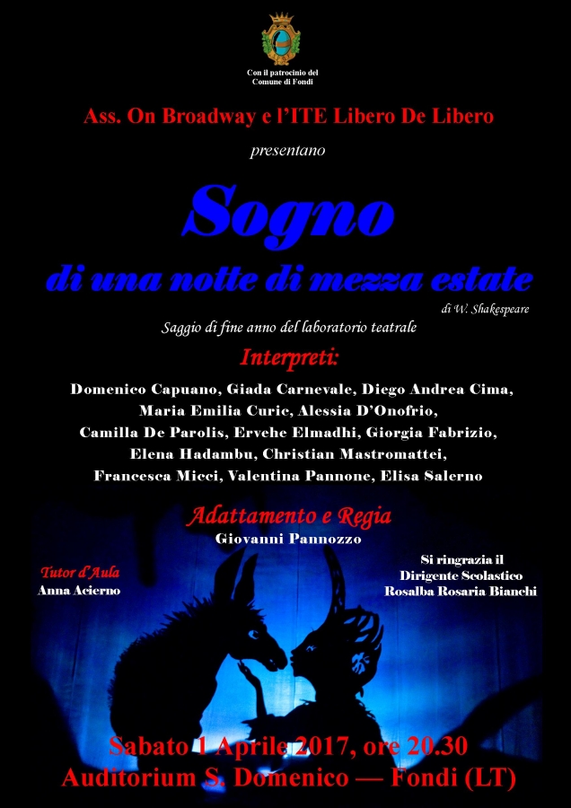 L'I.T.E. Libero De Libero di Fondi e l'Associazione Culturale dello Spettacolo "On Broadway", con il patrocinio del comune di Fondi, presentano sabato primo Aprile 2017 alle ore 20:30, presso l’Auditorium comunale di San Domenico di Fondi (LT), la rappresentazione teatrale “Sogno di una notte di mezza estate”, di William Shakespeare. I ragazzi saranno guidati dalla regia di Giovanni Pannozzo, con la collaborazione della prof.ssa Anna Acierno, assistente di scena dello spettacolo. È questa l’occasione giusta per apprezzare il lavoro svolto dagli alunni e per concludere al meglio il percorso del laboratorio teatrale.
