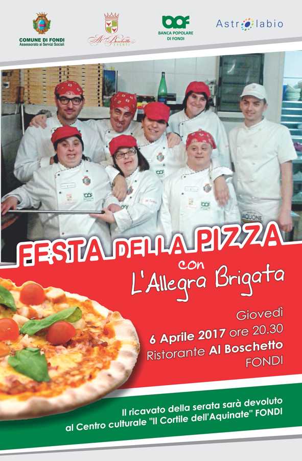 Giovedì 6 Aprile p.v. alle ore 20.00 presso il Ristorante “Al Boschetto” avrà luogo la festa finale del primo “Corso per Pizzaioli” riservato ai ragazzi diversabili del Centro diurno “L’Allegra Brigata”. L’iniziativa è promossa dall’Assessorato ai Servizi sociali del Comune di Fondi con il sostegno e la preziosa collaborazione della Banca Popolare di Fondi, del Ristorante “Al Boschetto” e della cooperativa sociale Astrolabio.