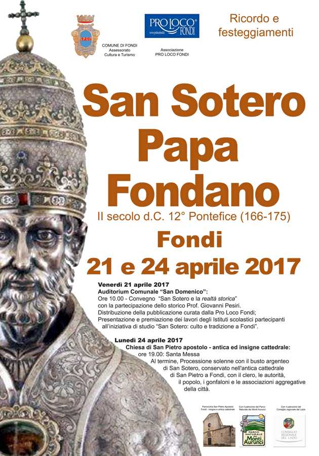 Venerdì 21 Aprile 2017, ore 10.00, Auditorium comunale “San Domenico”: convegno “San Sotero e la realtà storica”, con i saluti istituzionali del Sindaco De Meo e dell’Assessore Maschietto e l’intervento dello storico Prof. Giovanni Pesiri. Sarà distribuita la pubblicazione curata dalla Pro Loco Fondi e avrà luogo la presentazione e premiazione dei lavori degli Istituti scolastici partecipanti all’iniziativa di studio dal titolo “San Sotero: culto e tradizione a Fondi”.