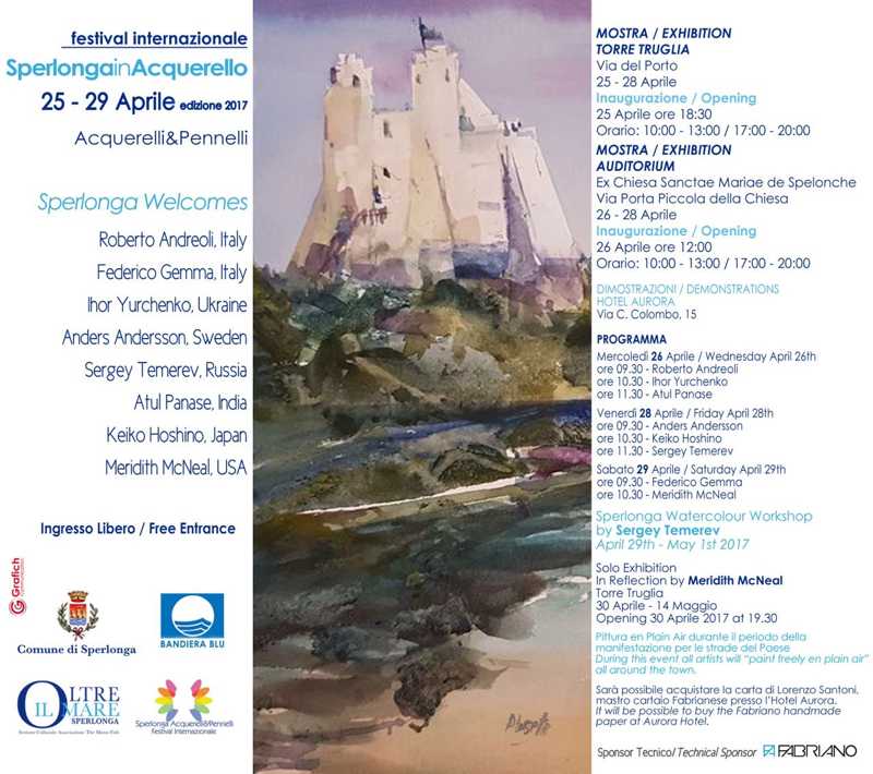 Sotto la guida delle appassionate organizzatrici di Sperlonga, M.Celeste Gagliardi e Annalisa Radice, coadiuvate da Anna Massinissa, presidente di Fabriano in Acquarello, il festival si appresta ad essere sempre di più una straordinaria fusion di culture, di idee e di esperienze artistiche diverse. Anche quest’anno le suggestive location dell’antica Torre Truglia e delle solari strutture dell’Hotel Aurora, sono state confermate sedi validissime e tradizionali dell’evento, ormai nel calendario degli appuntamenti italiani più prestigiosi dell’arte pittorica.