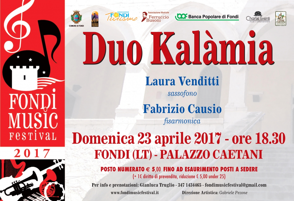 Continua senza soste il cartellone della VI edizione del Fondi Music Festival, manifestazione organizzata dall'Associazione Fondi Turismo in collaborazione con il Comune di Fondi, il Parco Naturale Regionale dei Monti Ausoni e Lago di Fondi, la Banca Popolare di Fondi, Charlie Eventi e l'Associazione musicale "Ferruccio Busoni". Il prossimo concerto della stagione 2017 si terrà domenica 23 aprile alle ore 18.30 a Fondi (LT) presso Palazzo Caetani e vedrà esibirsi il Duo Kalamia composto dalla sassofonista fondana Laura Venditti e dal fisarmonicista Fabrizio Causio. Il programma, estremamente variegato, spazierà dal barocco fino ai giorni nostri.