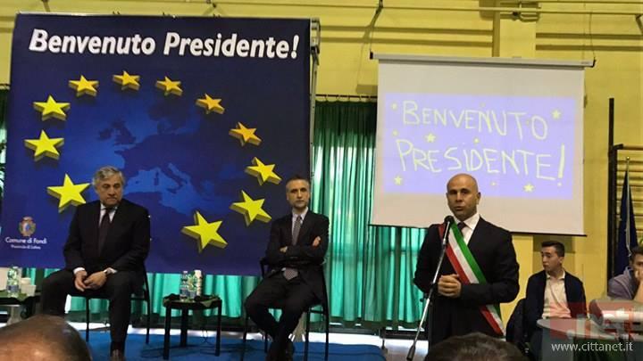 "La città di Fondi - è stato il commento del primo cittadino Salvatore De Meo - ha salutato il Presidente del Parlamento Europeo con i giovani ossia la parte della nostra comunità in cui ognuno ripone fiducia e speranza. Questo saluto particolare è' il modo migliore per augurare al Presidente un buon lavoro in questo prestigioso incarico e soprattutto testimoniargli la vicinanza di tutti noi con la convinzione che l'entusiasmo dei giovani rappresenti per lui un ulteriore spinta e determinazione ad affrontare le tante questioni europee. Con il Presidente Tajani abbiamo voluto dare ai giovani della città una grande opportunità di conoscenza dell'Europa. Tajani è' motivo di orgoglio degli Italiani e permettetemi dei fondani che dal 1994 hanno creduto in lui. Con lui l'Italia è protagonista in questo delicato momento in cui è l'Europa necessita di leader che sappiano consolidare e costruire un reale sentimento europeo ed intervenire nelle cose che non hanno funzionato. Nel l'agenda di Tajani c'è impegno ad avvicinare i cittadini all'Europa. Sicuramente con la sua presenza a Fondi e in altre città della nostra provincia sta concretamente riducendo le distanze".