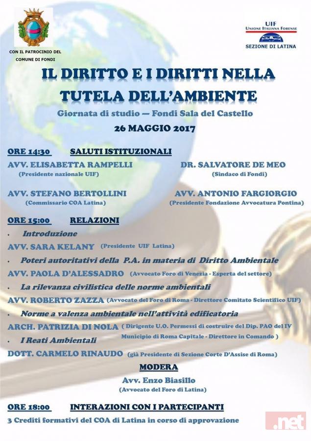 Si svolgerà venerdì 26 maggio dalle 14.30 a Fondi, nella storica cornice della Sala Convegni del Castello Caetani, la Giornata di studio sul tema “Il diritto e i diritti nella tutela dell’ambiente”, organizzata dalla sezione di Latina dell’UIF (Unione Italiana Forense). Ad aprire l’evento, i saluti istituzionali dell’avv. Elisabetta Rampelli, Presidente nazionale UIF, del Sindaco di Fondi Salvatore De Meo, dell’avv. Stefano Bertolini, Commissario COA Latina e dell’avv. Antonio Fargiorgio, Presidente Fondazione Avvocatura Pontina.