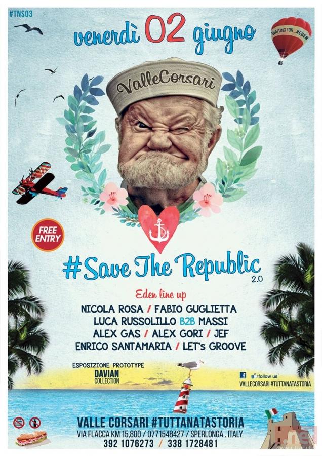 Dopo il grande successo dell'evento legato al 25 aprile scorso, il team del Valle Corsari in attesa dell'apertura definitiva della stagione 2017, propone la terza edizione di: “Save the Republic” in collaborazione con House Folies, House Lab e Simpatia Staff. Venerdì 2 giugno, per un intero giorno sul garden del club, dj, artisti, pr, e il pubblico tutto, si incontra, tra un disco e un drink, ballando e parlando in totale relax. Una formula semplice che ha trovato nel fuori stagione del Valle, una vera e propria location d'eccezione. Alla consolle dalle 12 in poi si alterneranno i dj Nicola Rosa, Fabio Guglietta, Luca Russolillo, Massi, Alex Gas, Alex Gori, Jef, Enrico Santamaria e Let's Groove. Una serie di dj tra nomi emergenti e altri conclamati, con un unico scopo: buone vibrazioni, buona musica, sorrisi. Durante il giorno si potranno gustare squisiti drink e apprezzare il cibo preparato appositamente per l'occasione. Insomma ingredienti semplici per un giorno di relax totale tra il verde del giardino e il mare di Sperlonga. Esposizione Prototype by Davian Collettion. Valle Corsari via Flacca Km 115.600. Sperlonga. Info 392 10 76 273 - 338 17 28 481. Ingresso gratuito.