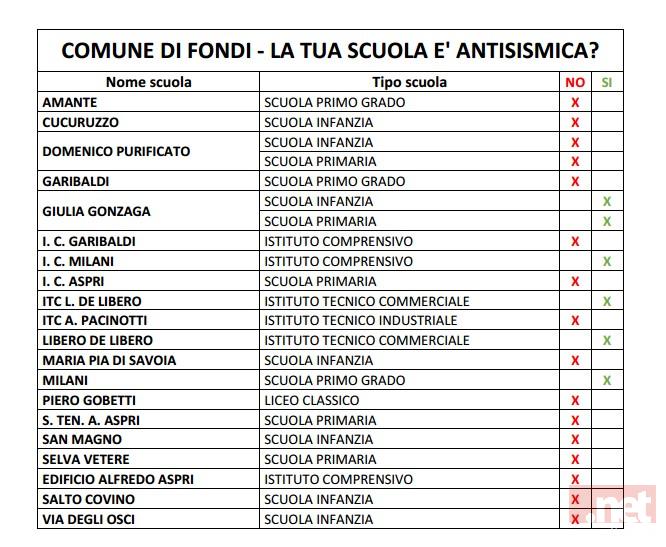 Sono diversi mesi che gli attivisti del Meetup “Amici di Beppe Grillo di Fondi” chiedono all’Amministrazione Comunale la Certificazione Antisismica delle strutture scolastiche di Fondi senza aver ricevuto alcuna risposta. Abbiamo anche fatto un esposto il 21 aprile 2017 per la mancanza di trasparenza dell’amministrazione ed abbiamo inviato una segnalazione al Difensore Civico della Regione Lazio denunciando la mancanza di trasparenza e la violazione di una legge dello Stato che regolamenta la materia. L’unica risposta avuta dal Comune di Fondi è stata quella del Segretario Generale Dott.ssa Anna Maciariello che ci avvisava di aver inoltrato agli uffici competenti la nostra richiesta e che questo era il suo compito come previsto dalla legge, forse dimenticando che il suo ruolo di Responsabile della Trasparenza e dell’Anticorruzione dell’ente le impone anche il controllo sull’operato dei dirigenti e dipendenti comunali.