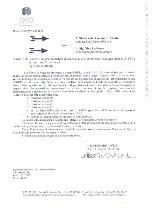 Da mesi abbiamo in corso una diatriba con il Comune di Fondi per la mancanza di trasparenza dell’ente in quanto non consentono ai cittadini l’accesso agli atti, come previsto dalla legge vigente in materia (F.O.I.A.). Il 21 di aprile 2017 inviammo al Comune di Fondi un esposto avvisando che in caso di ulteriore diniego ci saremmo rivolti al difensore Civico della Regione Lazio che oggi ci ha risposto riconoscendo giusta la nostra richiesta e chiedendo al Sindaco di procedere con la consegna dei documenti richiesti.