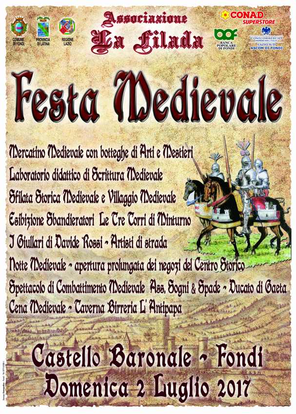 I fasti del Medioevo rivivono nell’incantevole scenario del Castello Baronale di Fondi grazie alla Festa Medievale, una serata tra dame, cavalieri, giullari e mercatini di arti e mestieri. L’associazione La Filada, organizzatrice dell’evento, si propone di rievocare la storia medievale nelle sue forme più particolari e suggestive. Incuriosire il visitatore guidandolo in un tempo passato attraverso la ricreazione di un mercato storico, composto da artigiani ed artisti adatti tanto all’adulto quanto al bambino, che si struttura per gradi e che spesso prevede anche la partecipazione pratica del visitatore.