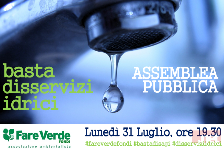 Come anticipato questa mattina, il Gruppo Locale di "Fare Verde" ha approfondito la questione relativa ai disservizi idrici registratisi nel territorio della nostra Città e nell'intero comprensorio e intende affrontarla incontrando pubblicamente Cittadini, Associazioni, Istituzioni. Per questo motivo è stata indetta un'Assemblea Pubblica per Lunedì 31 Luglio, alle ore 19.30, nella Sede di Via Cesare Balbo 12. La nostra Associazione Ambientalista vuole confrontarsi con chi in questi mesi sta vivendo quotidianamente disagi e danni, presenterà le proprie proposte e ascolterà quelle di chi vorrà prendere parte all'incontro.