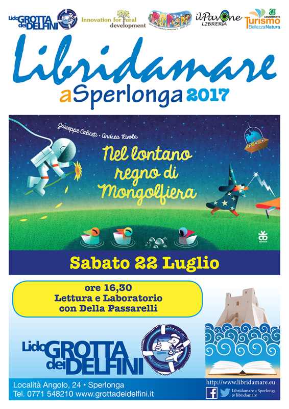 Secondo incontro per Libridamare a Sperlonga 2017, sabato 22 luglio alle ore 16:30, presso il lido Grotta dei Delfini. Questa volta avremo la possibilità di conoscere “Nel lontano regno di Mongolfiera”, di Giuseppe Caliceti e Andrea Rivola, edito da Sinnos. Anche questo volume ci si apre davanti con tutta la magia del gioco e dell’immaginazione. È un libro davvero speciale, le cui storie si dispiegano lungo il corso di venti parole. Venti parole semplici e apparentemente senza nessi, come fagioli, lavatrice, castello, chiave inglese, trottola, cinghiale, bambino da cui nasce la possibilità di combinazioni che daranno vita a otto storie diverse al gusto dell’imprevedibile.